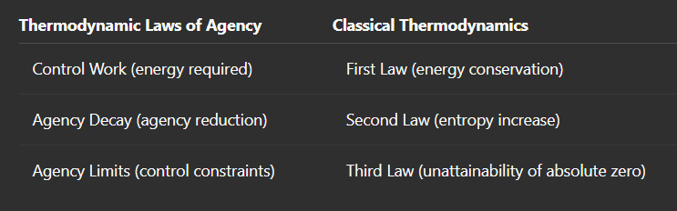 Purpose vs. Generality: The agency laws specifically address intentional actions and decision-making capabilities, emphasizing control and intentionality. Classical thermodynamics broadly addresses universal physical systems without intentional agency.