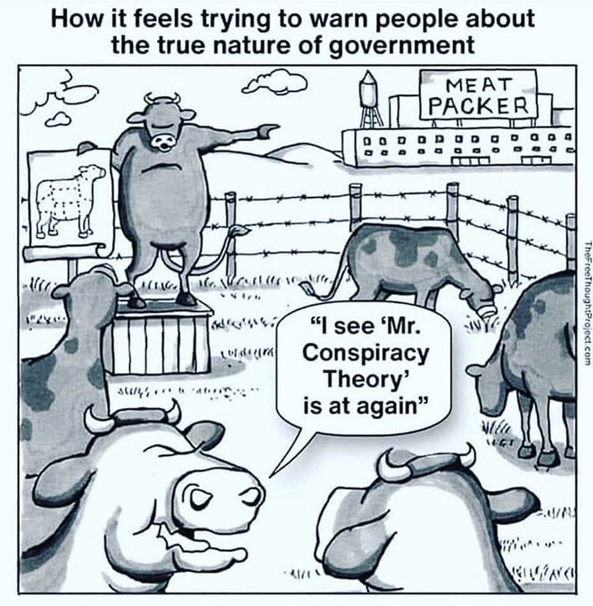 There’s a cartoon making the rounds that shows a cow standing on a crate, pointing toward the “Meat Packer” building in the distance. Around him, the other cows graze indifferently. One turns to another and says, “I see Mr. Conspiracy Theory is at it again.”