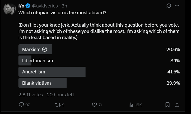 Anarchism, initially deemed most absurd by the poll, requires careful distinction. Naive anarchism expects large-scale coordination without coercive enforcement or formal reputation systems, which indeed borders on absurdity. However, practical anarchism—such as anarcho-capitalism or market anarchism—is theoretically robust and practically credible, as it explicitly addresses incentives, property rights, and dispute resolution through decentralized mechanisms. This form of anarchism is not absurd but rather empirically defensible.