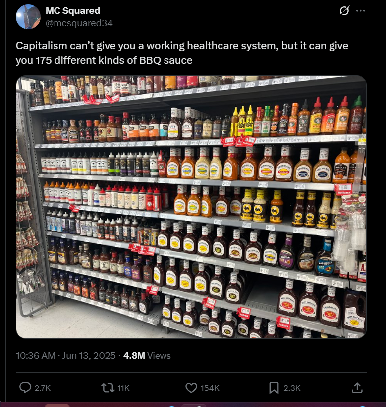 There's a popular meme circulating social media recently: a photo of supermarket shelves stocked with dozens of BBQ sauces, captioned with the critique, "Capitalism can't give you a working healthcare system, but it can give you 175 different kinds of BBQ sauce."