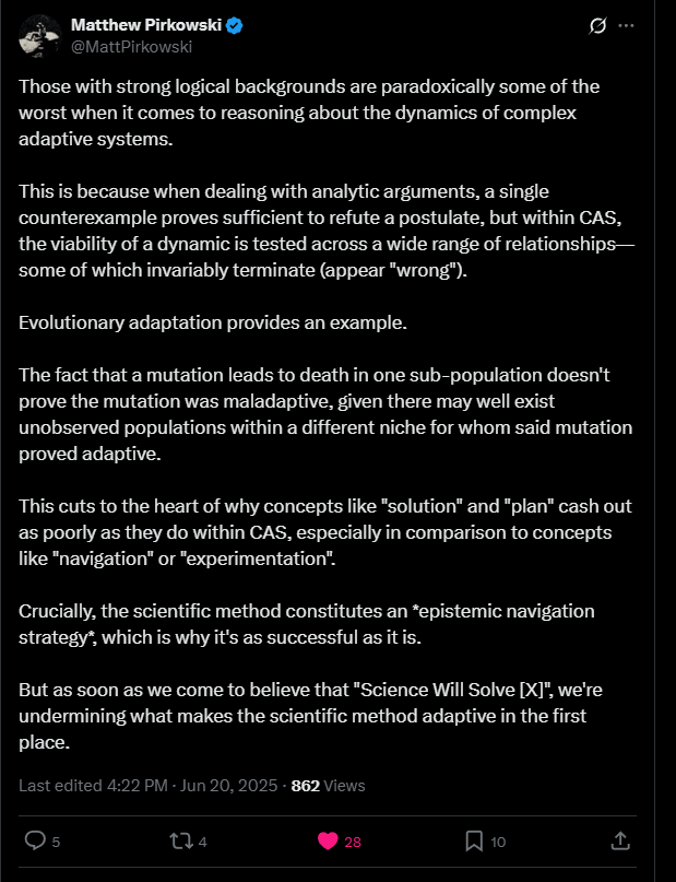 Those trained rigorously in formal logic often struggle most when faced with Complex Adaptive Systems (CAS). Matthew Pirkowski captures this paradox succinctly: logic's rigor can become its greatest weakness precisely because CAS resist deductive certainty.