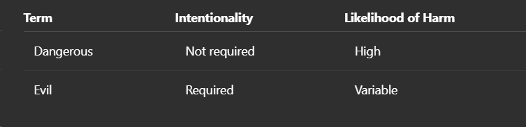 Dangerous refers solely to the potential or likelihood of harm, irrespective of intent. A dangerous entity or situation has a high probability of reducing agency but does not require any malicious intention. Natural disasters, accidents, or unintended consequences of otherwise benign actions fall into this category.