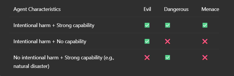 A menace is deliberately malicious (evil) and sufficiently capable (dangerous) to pose a genuine, credible threat.