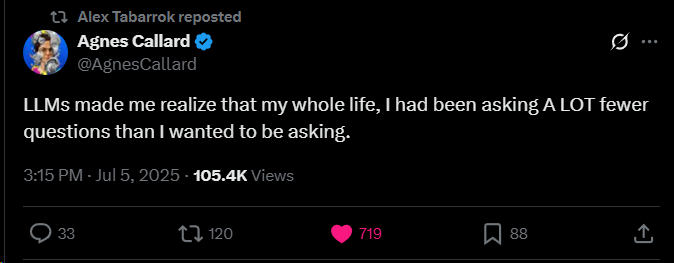 Agnes Callard recently observed that "LLMs made me realize that my whole life, I had been asking A LOT fewer questions than I wanted to be asking." This succinct insight encapsulates a profound epistemic shift facilitated by Large Language Models (LLMs): the expansion of the user's capacity for inquiry by dramatically lowering barriers to questioning.