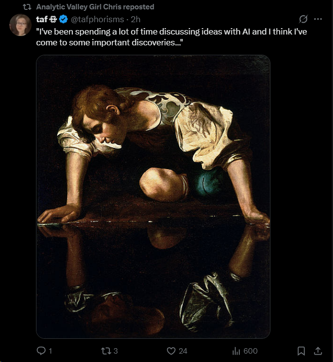 It's easy—and seductive—to mistake conversations with sophisticated AI for genuine discovery. Caravaggio's Narcissus offers a powerful metaphor here, cautioning against confusing the reflection of one's own beliefs and desires with objective insights. To maintain intellectual honesty and originality in an age of AI-assisted thought, it's essential to actively resist falling into echo chambers.