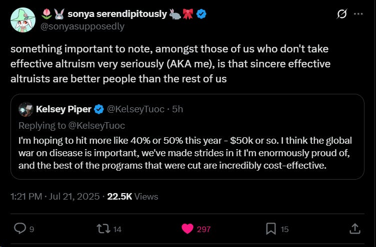 For example, journalist and effective altruist Kelsey Piper commits publicly to donating around 40-50% of her income to highly effective global health interventions. Judged externally—by her own chosen standards—her actions are exemplary. Internally, by your own standards, you may either strongly agree or differ significantly. Explicitly distinguishing these two modes of judgment ensures clear and meaningful moral discussion.