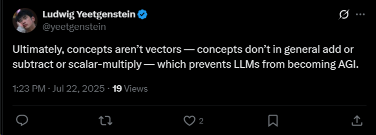 "Ultimately, concepts aren’t vectors—concepts don’t in general add or subtract or scalar-multiply—which prevents LLMs from becoming AGI."
