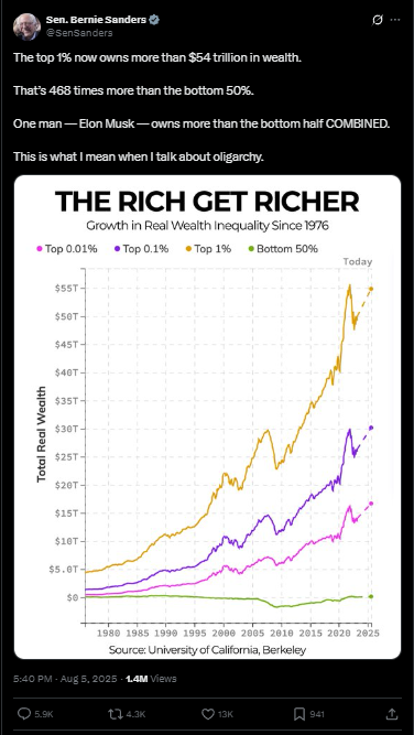 Sanders’s tweet is misleading on its own terms and exposes a contradiction in his rhetoric. His personal wealth places him far above millions of Americans in precisely the way he criticizes others for. The real issue is not inequality itself but the misuse of statistics to imply harm where none is inherently present.