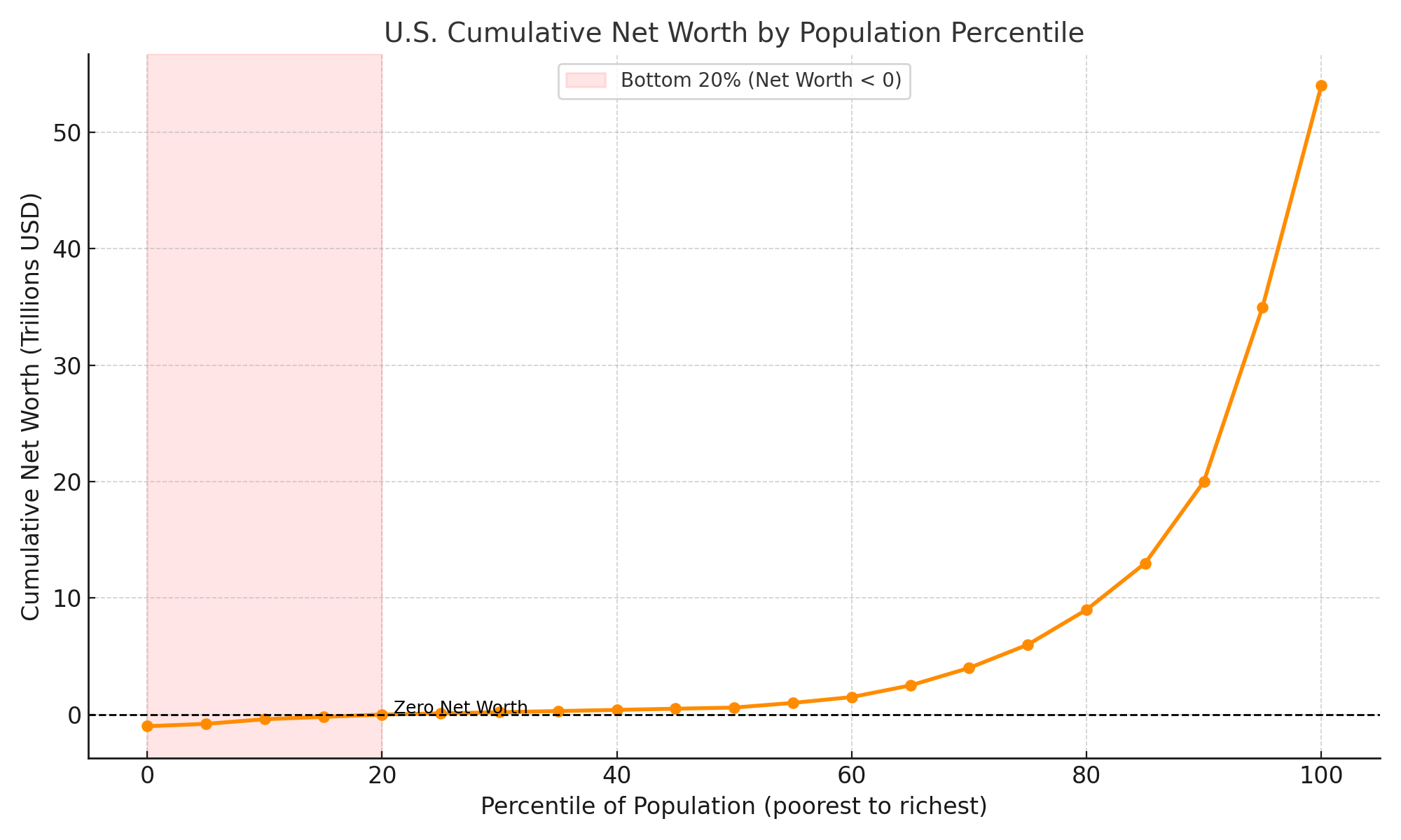 In the U.S., the bottom 20% of Americans have negative combined net worth. Debt outweighs assets in aggregate, largely due to student loans, mortgages, and other liabilities.