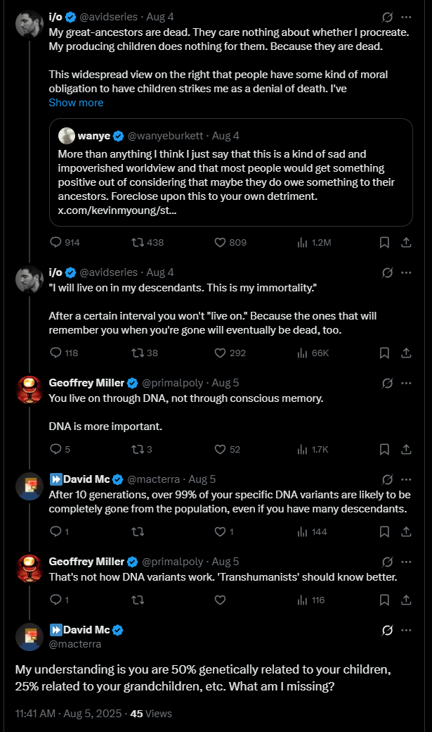 If your goal is to “live on,” cultural legacy is far more robust than genetic legacy. A mathematical theorem in population genetics says that in a randomly mating population, the probability that a given individual has any living descendants eventually approaches one — but the probability that they carry any specific genetic material from you approaches zero.