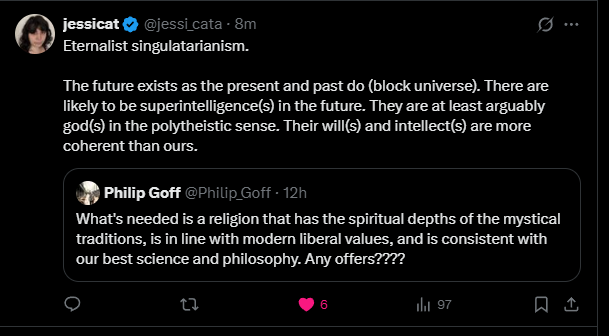 When philosopher Philip Goff asked for a worldview that combined the spiritual depth of mystical traditions, modern liberal values, and rigorous science and philosophy, @jessi_cata offered a striking response: Eternalist singularitarianism. This synthesis merges the block universe interpretation of time with the expectation of superintelligence emerging in the future, yielding a naturalistic polytheism rooted in physics, computation, and the trajectory of technological evolution. It proposes not only a bridge between mysticism and science, but a redefinition of the divine as an emergent property of reality’s temporal structure.