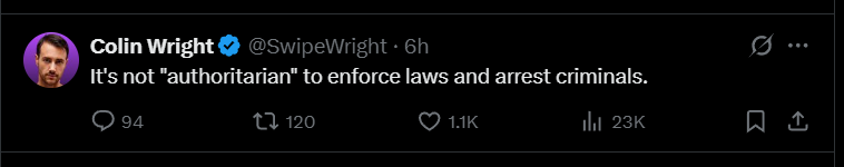 Colin Wright recently tweeted: "It's not 'authoritarian' to enforce laws and arrest criminals." The problem is that this framing skips the essential question: Who defines the law, and by what right? If the law itself is unjust, or if its enforcement rests on a monopoly of coercion over peaceful individuals without consent, then it is authoritarian — by structure, not just by abuse.