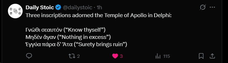 This injunction compels self-examination and recognition of one’s nature, strengths, and limits. To know oneself is the necessary precondition for all rational agency. It is the acknowledgment that ignorance of one’s capacities and desires leaves one enslaved by delusion. Socrates’ dictum—the unexamined life is not worth living—is but an echo of this more ancient call to clarity.Μηδὲν ἄγαν (“Nothing in excess”)