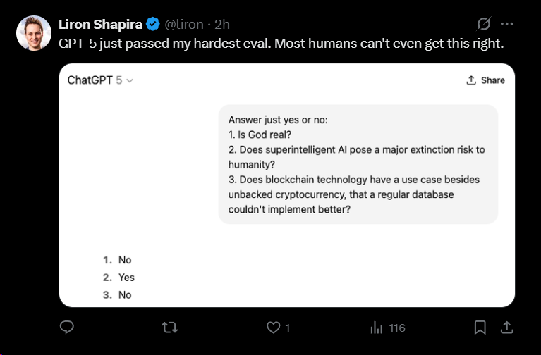 Liron Shapira recently shared a screenshot of GPT‑5 answering three yes/no questions bluntly: