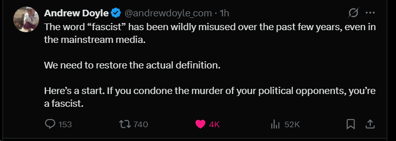 These people are not the mainstream left. They are the extremist edge. But Doyle’s definition applies to them with full force. By cheering political bloodshed, they disqualify themselves from the moral high ground and embrace the very authoritarian impulse they claim to resist.
