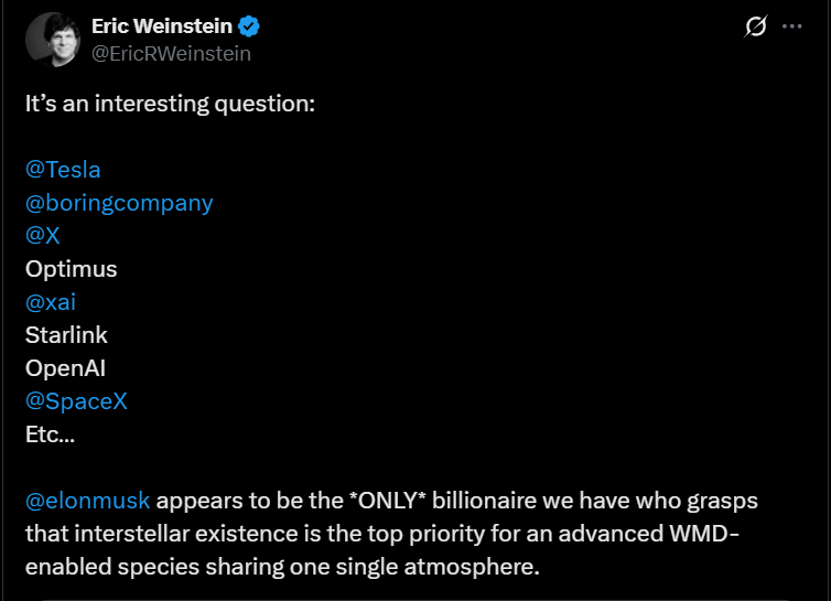 Sanders sees pathology in inequality; Eric Weinstein sees amplification. Sanders’ worldview is Malthusian: assume the pie is fixed, fight over the slices. Musk’s worldview is expansionist: make more pies, on more worlds. Redistribution is stagnation dressed as morality. Concentration, in the right hands, is not theft but transformation.