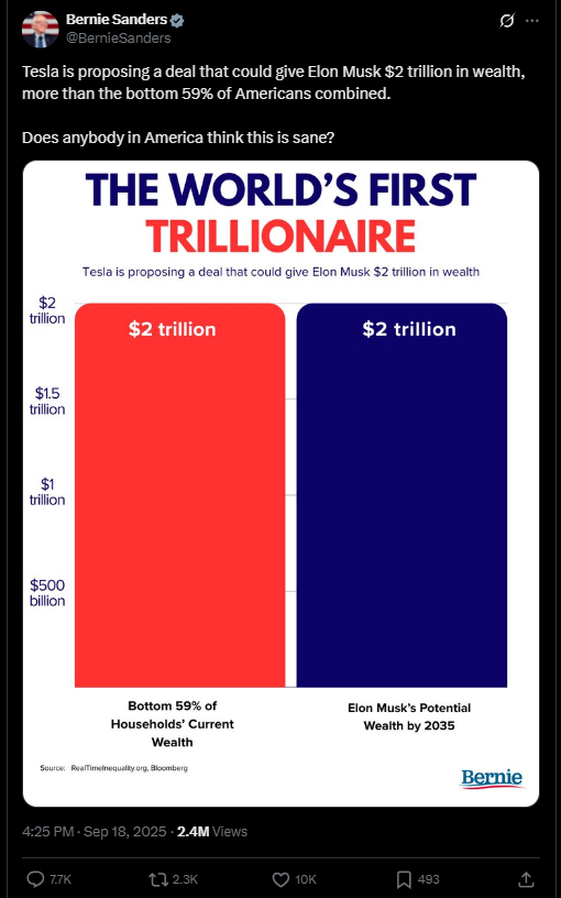 “Tesla is proposing a deal that could give Elon Musk $2 trillion in wealth, more than the bottom 59% of Americans combined. Does anybody in America think this is sane?”
