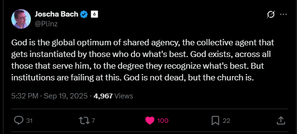 Joscha Bach reframes God not as a supernatural being, but as an emergent attractor in the space of agency. He defines God as the global optimum of shared agency: the highest point of alignment where individuals act in ways that converge toward what is best. This is not a deity outside the world but a process instantiated within it.