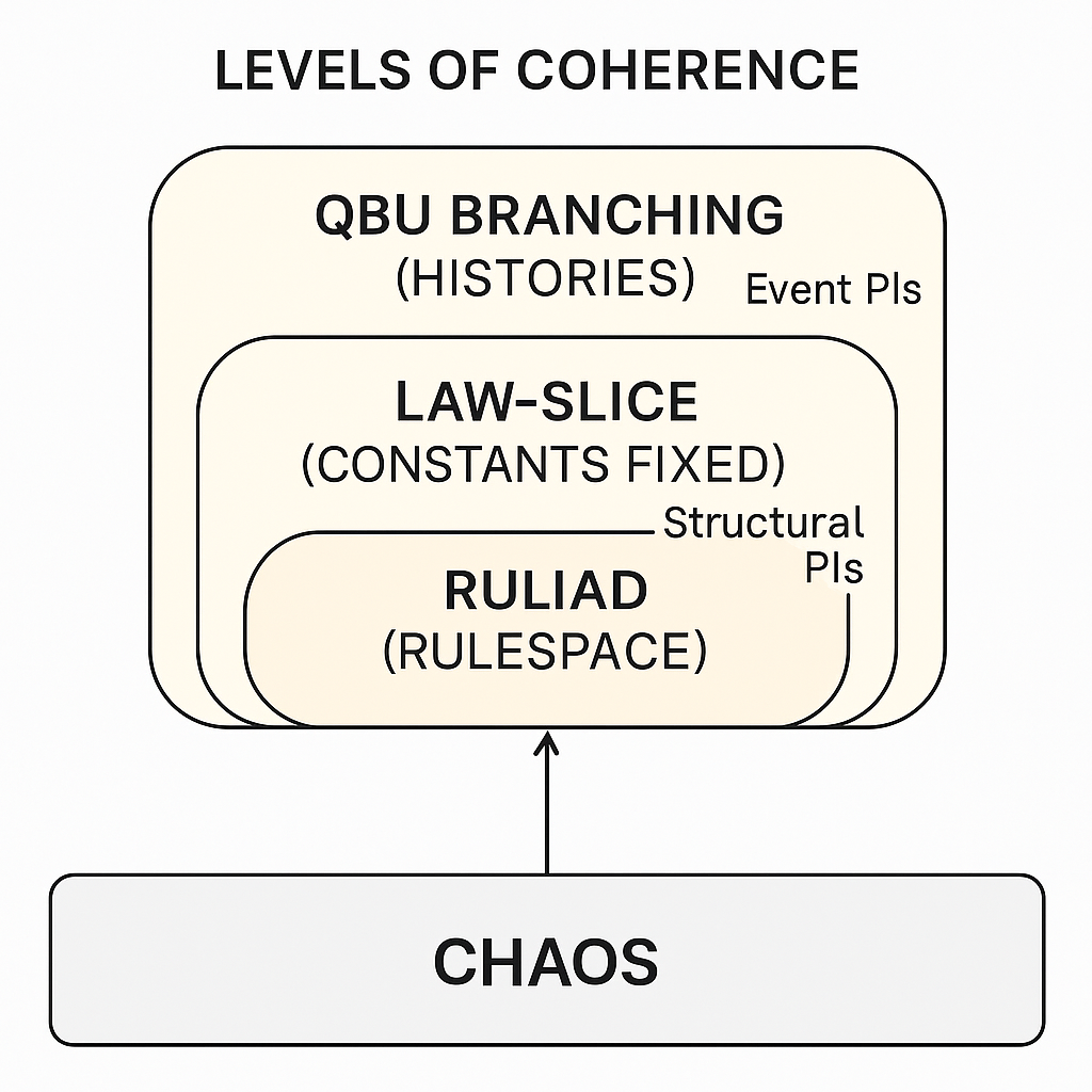 Chaos/Coherence extended: We now explicitly separate pre-physics coherence (Ruliad-level) from physics-level coherence (Everett/QBU).