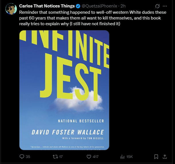 Infinite Jest is a book about the annihilation of agency under the weight of abundance. The postwar West, for its most comfortable men, removed the ancient struggle against famine, plague, and cold. Survival became trivial. But when necessity vanished, so did the scaffolding of meaning.