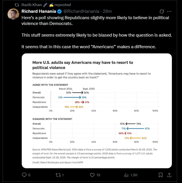 Richard Hanania recently highlighted an NPR/Marist poll showing Republicans slightly more likely than Democrats to believe that “Americans may have to resort to political violence.” His observation was correct — not because it revealed anything about partisanship, but because it exposed the question itself as the real instrument of bias. The subtle ambiguities in phrasing aren’t incidental; they are the entire point.