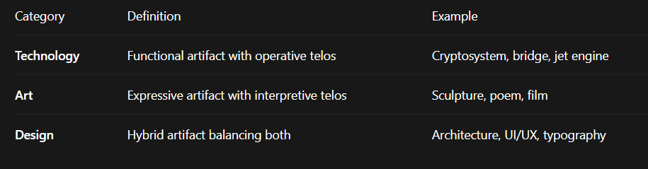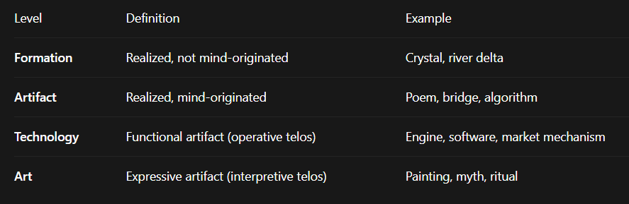 Artifact: A realized pattern that originated in a mind and serves a telos—either operative (instrumental) or interpretive (expressive).