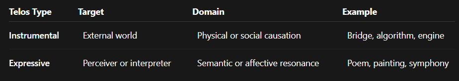 Instrumentality is about operating on matter, energy, or behavior; expressivity is about operating on meaning, perception, or emotion. Both are causal, but in different spaces.