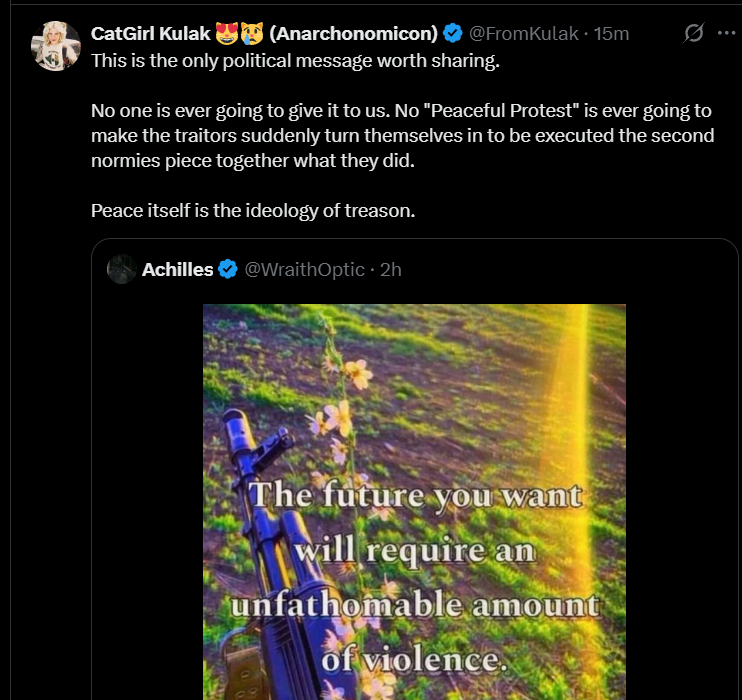 A viral post declares: “Peace itself is the ideology of treason.” Beneath it, a rifle lies across a field of flowers with the caption: “The future you want will require an unfathomable amount of violence.” It’s not merely a meme. It’s an ideological inversion — a rejection of everything life-affirming.