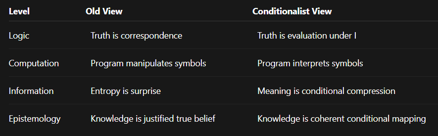 Computation gives us syntax; Tarski gives us semantics; Gödel and Chaitin reveal the boundaries of both. Conditionalism unifies them under one rule: