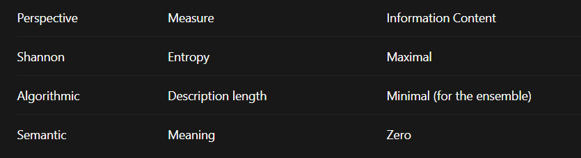 Semantic information – Chaos contains no meaning until coherence emerges. Information, in the semantic sense, requires recognition and compression by an agent. Randomness alone communicates nothing.