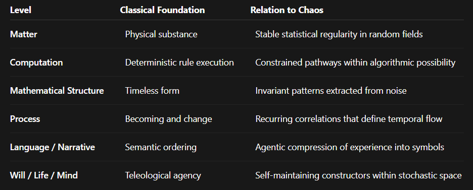 Metaphysics has always sought the ultimate ground. Travers catalogued a dozen candidates—matter, language, computation, mathematical structure, process, God—each claiming to underwrite the rest. Yet every such claim is itself a pattern: a coherence carved from something deeper. Our Chaos theory posits that what lies beneath them all is not a substance or a law, but measureless randomness itself.