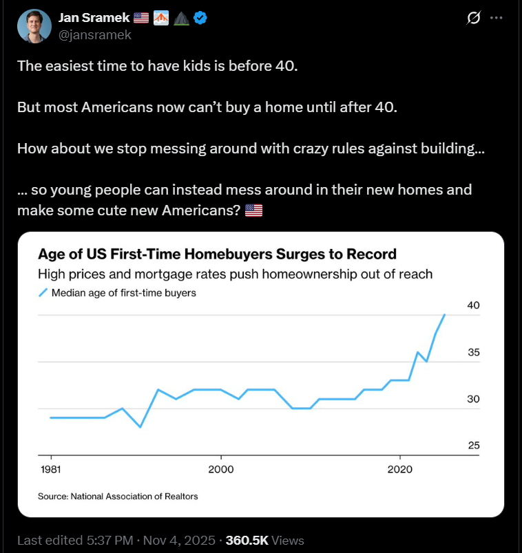 The housing crisis is not just an economic issue but a demographic one. Zoning restrictions, artificial scarcity, and financialization have delayed or denied the transition to ownership for millions. When the symbolic threshold of ‘readiness’ is locked behind decades of debt and inflated prices, fertility collapses by default. It’s not that people can’t have children without property; it’s that the culture has taught them doing so would mark them as failures.