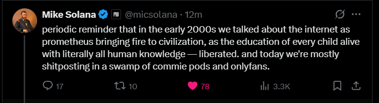 The internet’s current state is not a failure relative to its ideals. It is simply the early Gutenberg phase of a vastly accelerated media cycle. A world where universal knowledge is accessible but unevenly used is not the betrayal of the dream—it is the recurring human pattern whenever Prometheus hands us fire.