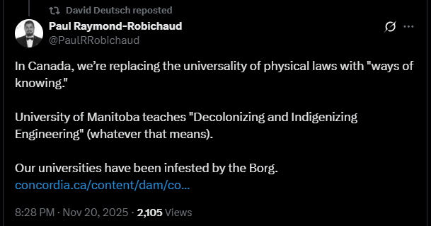 When a curriculum reframes engineering as a cultural practice among other practices, it risks dissolving the very structure that makes engineering universally effective. The “Decolonizing and Indigenizing Engineering” course described in Paul Raymond-Robichaud’s tweet does exactly this. It treats engineering as a culturally situated worldview, collapses the distinction between empirical method and narrative tradition, and replaces predictive rigor with reflective exercises. The result is not inclusion; it is epistemic drift.