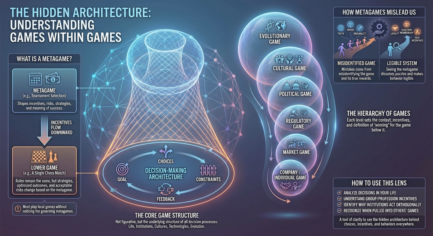 If the game is chess, the metagame is choosing which tournaments to enter — a decision that shapes incentives, opponents, risk profiles, preparation strategies, and the meaning of success.
