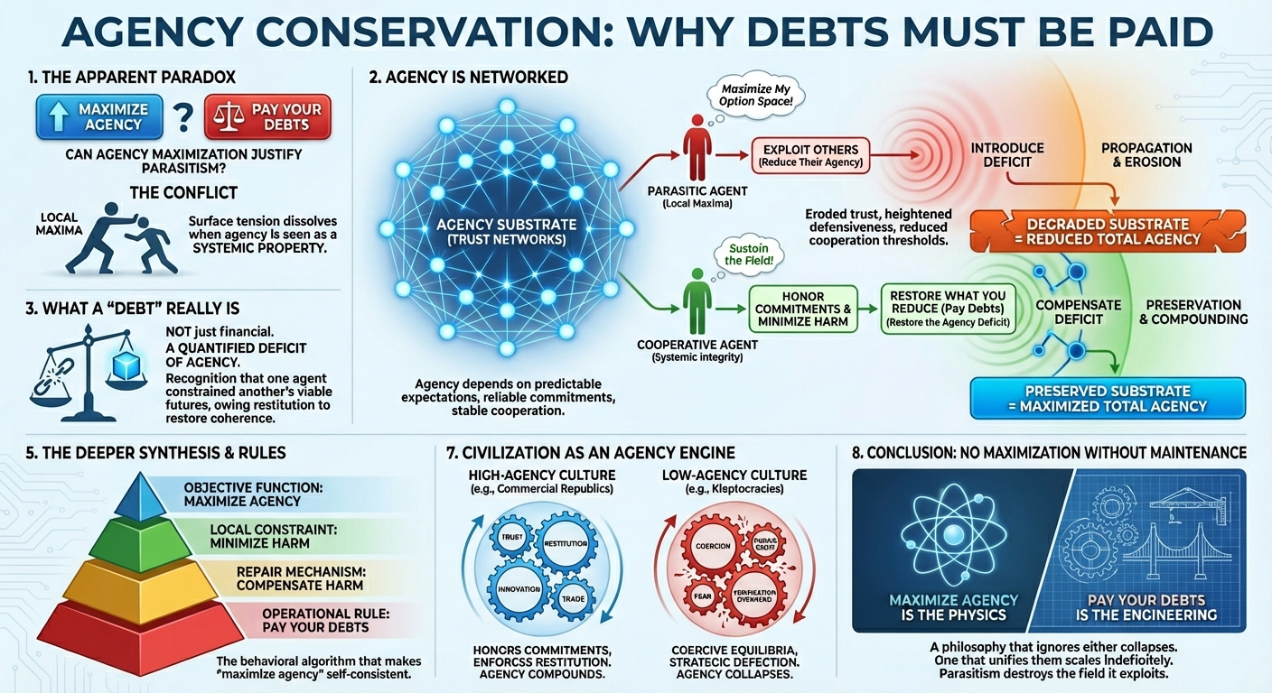On the surface, “maximize agency” and “pay your debts” look like different ethical layers. One operates at the level of civilizational architecture; the other reads like a moral injunction from a desert trading culture. But the tension dissolves once you examine the mechanics of agency itself. The key is understanding that agency is not a private commodity. It is a systemic property of a multi-agent environment. Any attempt to enlarge one’s own freedom of action at the expense of the system that supports it is, in the strictest sense, self-defeating.