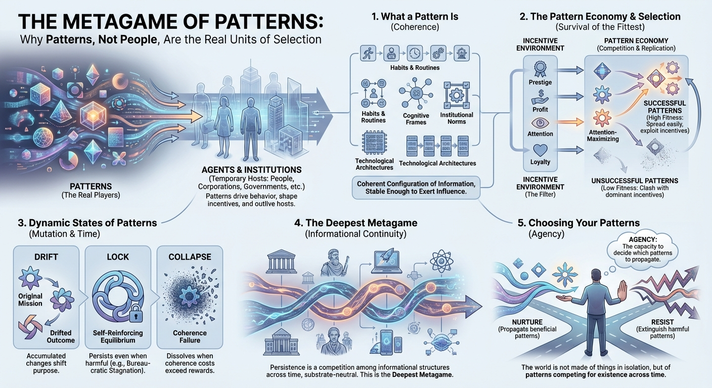 Patterns drive behavior, shape incentives, influence institutions, and outlive the agents who instantiate them. When a scientist publishes for prestige, a politician signals loyalty, a corporation chases quarterly metrics, or a movement drifts away from its founding mission, the real actor is a pattern: a stable configuration of behavior and incentives that has learned how to survive.