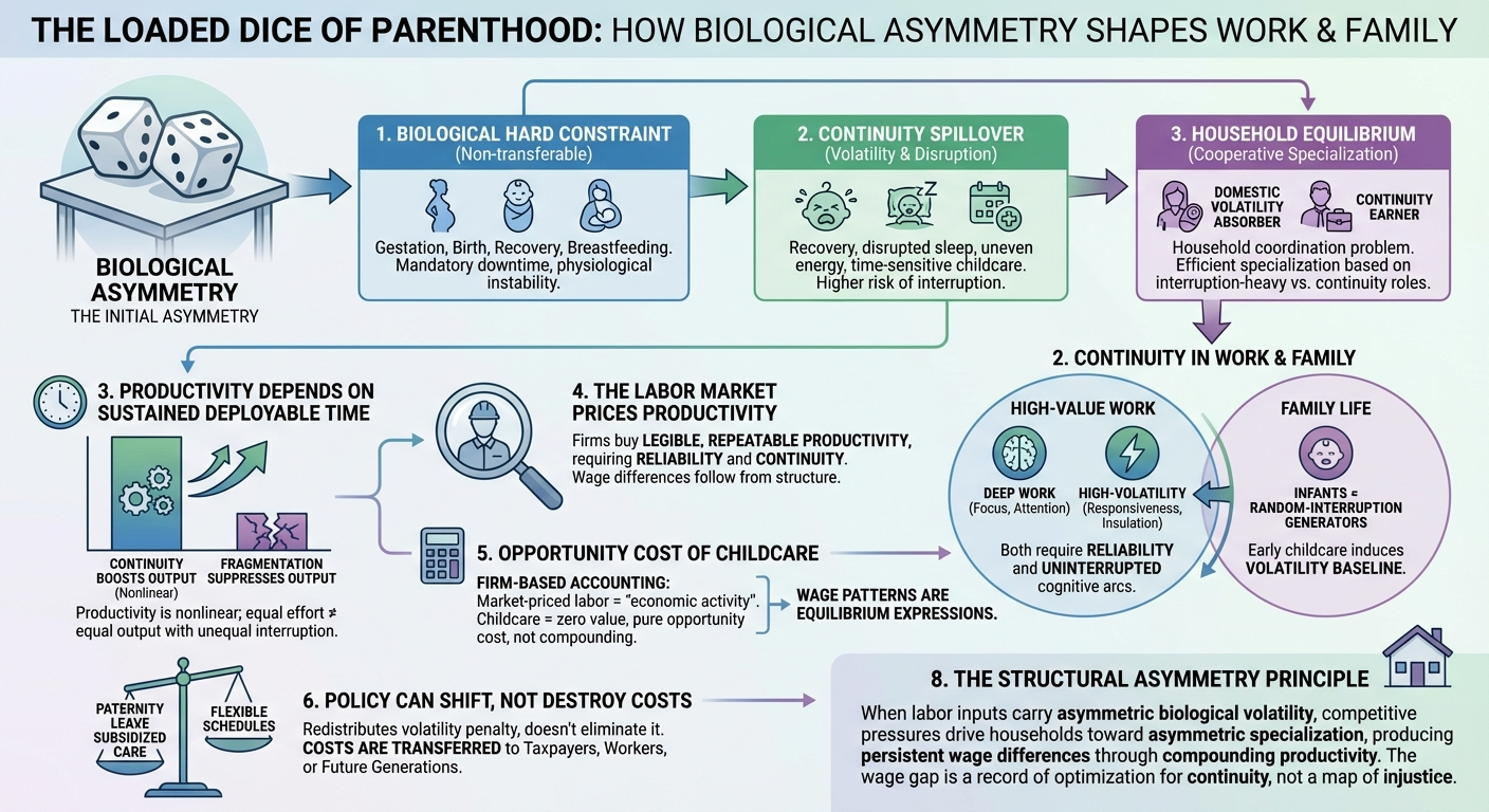 Human labor markets do not begin from a neutral baseline. They rest on an asymmetric biological foundation: one sex absorbs the non‑delegable physiological costs of gestation, childbirth, postpartum recovery, and early breastfeeding. These events do not predetermine years of childcare, but they do impose an early volatility penalty—a structural disturbance that affects continuity, availability, and productivity at precisely the stage when careers typically begin compounding.