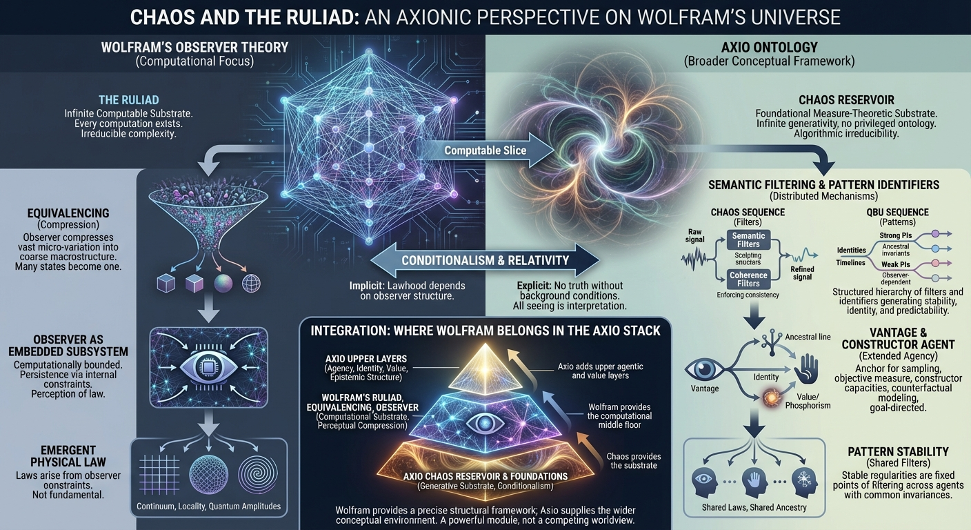 The theories align cleanly. What Wolfram models as the Ruliad corresponds to the computable stratum of Chaos. What he frames as equivalencing appears in Axio as a structured hierarchy of semantic filters and Pattern Identifiers. What he calls observer persistence maps naturally onto Axio’s formalisms of Vantage and ancestry.