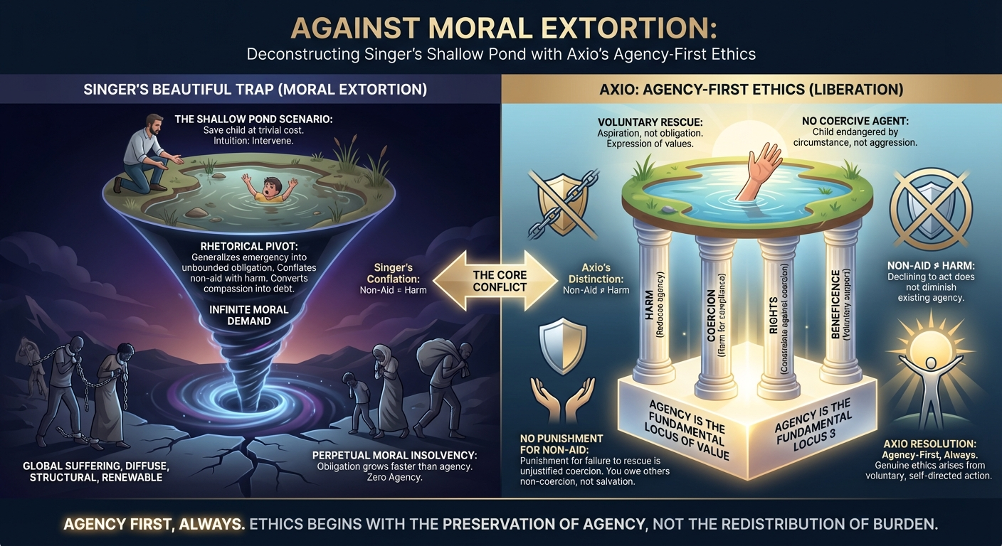 Singer’s parable succeeds rhetorically because it quietly conflates non-aid with harm, converting compassion into debt. Under Axio’s agency-first ethics, that conflation is invalid.