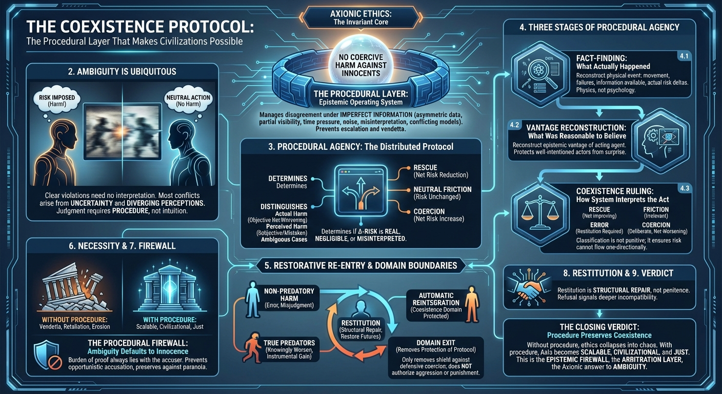Without the Procedural Layer, Axionic Ethics collapses under its own precision. In high‑friction environments, misinterpretation is constant. If every perceived risk justified retaliation, society would dissolve into vendetta; if genuine predators hid behind ambiguity, cooperation would erode. Procedural Agency prevents both failure modes. It forces evidence, reconstructs vantage, and classifies proportionally—scaling Axio from personal ethics to civilizational architecture.
