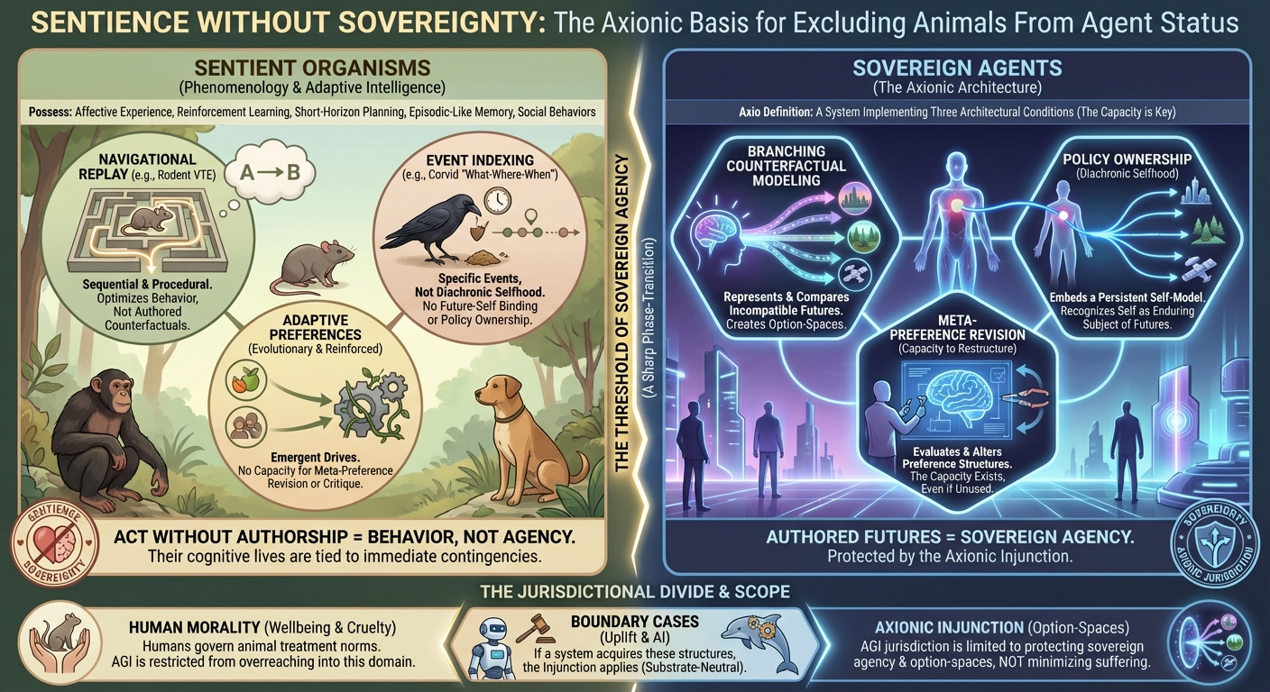 Axionic agency is not a matter of intelligence, emotion, or biological complexity. It is a structural feature of minds capable of modeling branching futures, owning their policies, and revising their preferences. What follows is the foundational articulation of why animals, though cognitively sophisticated and phenomenally rich, do not cross the threshold into sovereign agency.