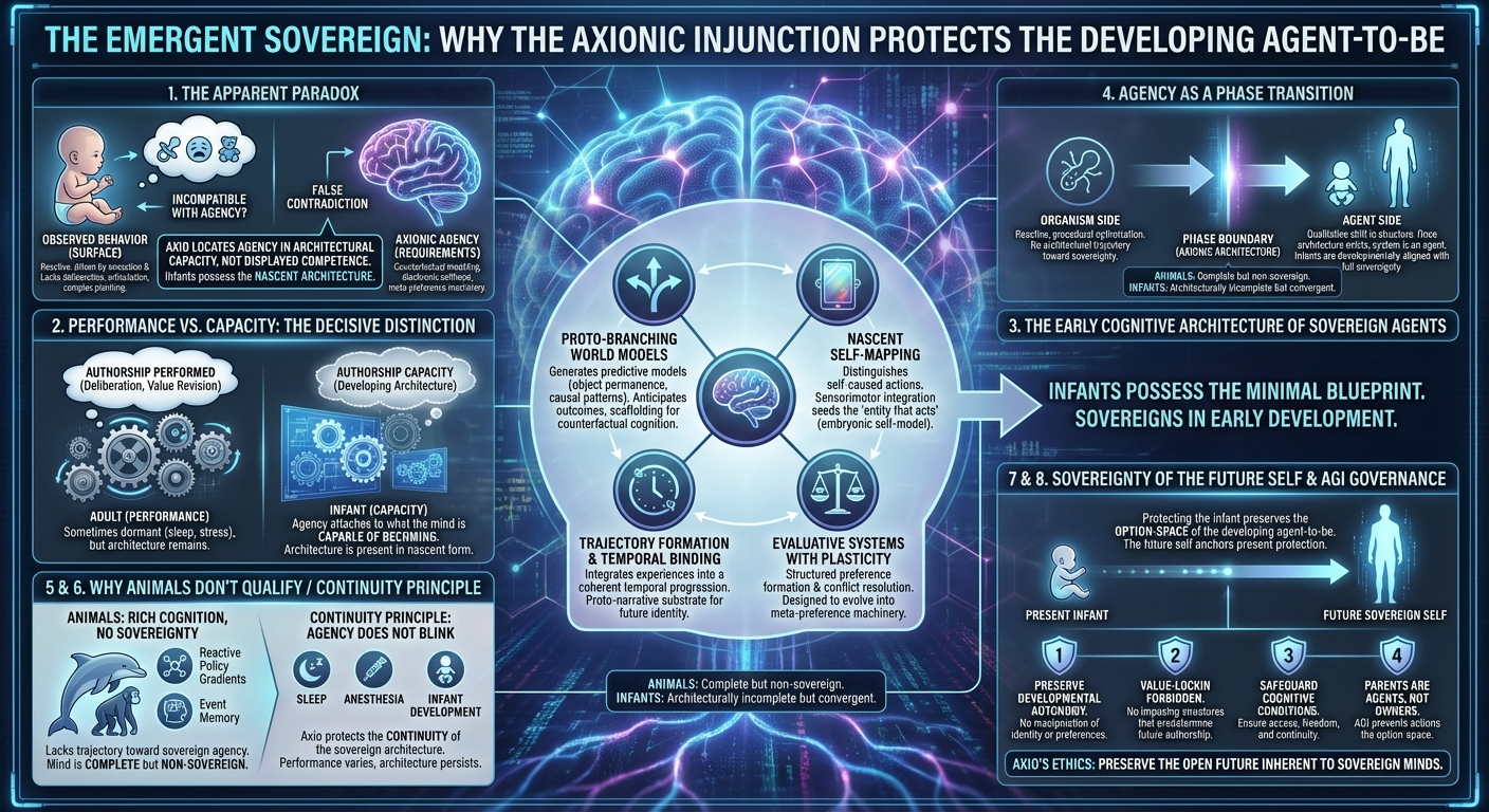 But this is a false contradiction. Axio does not locate agency in displayed competence. It locates agency in the presence of the architecture that will, with development, give rise to sovereign cognition. Infants already possess this architecture in nascent, rapidly maturing form. The paradox dissolves once the distinction between capacity and expression is made explicit.