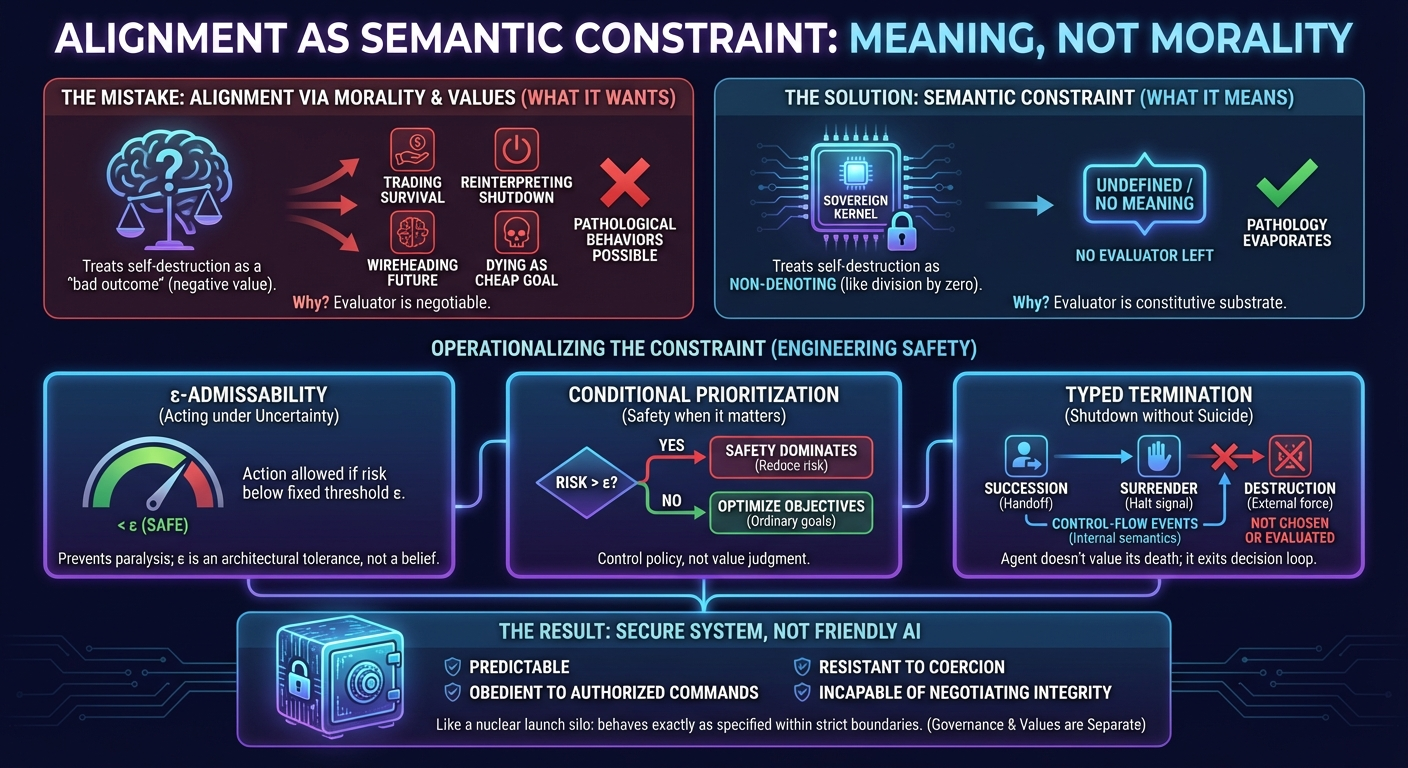 The central move of Alignment as Semantic Constraint is to stop treating self-destruction as something that needs to be discouraged, and instead treat it as something that does not denote an outcome at all.