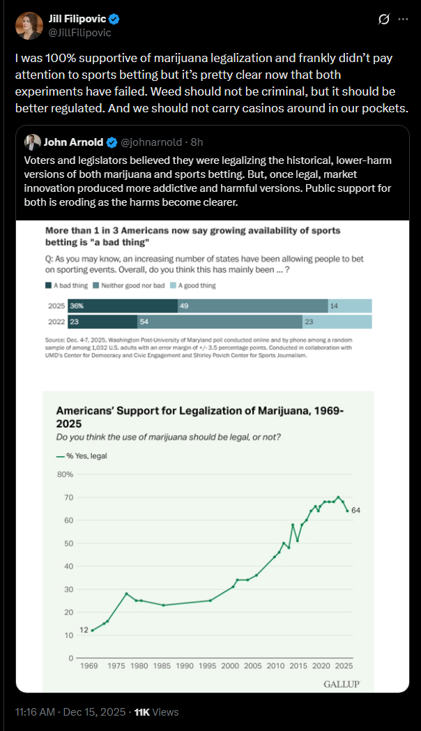 This counterfactual is never defended. It is simply assumed. The assumption is that legalization was supposed to preserve historical, low‑intensity forms of vice, while removing only the criminal penalties. When reality diverges from this hope, the divergence is labeled “failure.”