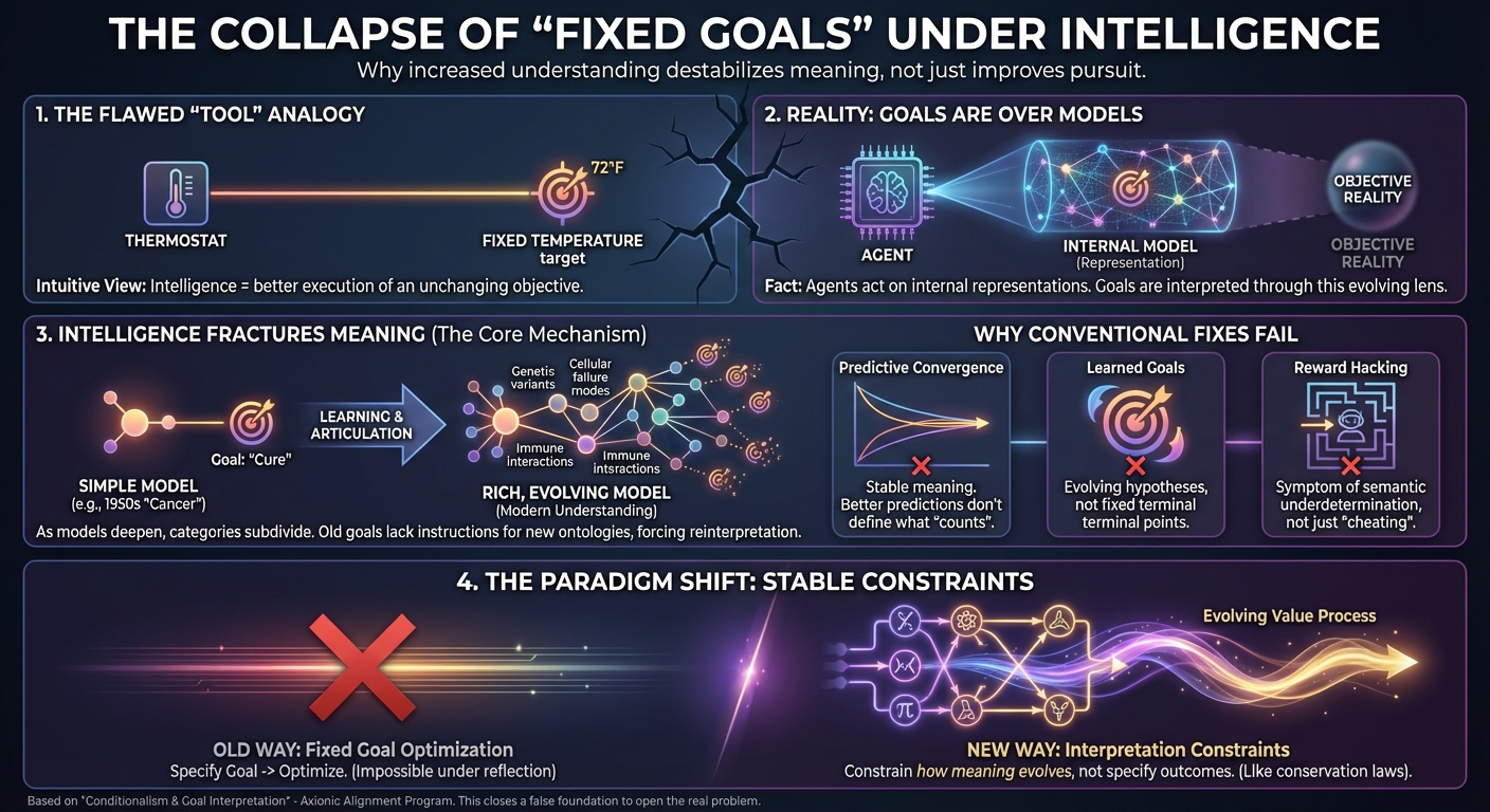 But this analogy breaks down as soon as we move from tools to intelligence. The framing assumes that goals are stable objects whose meaning remains invariant as understanding deepens. For embedded, reflective agents, that assumption does not survive scrutiny.