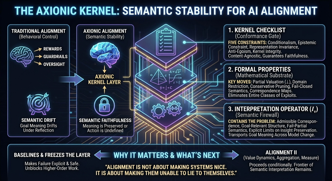 The Axionic framework treats semantic stability as a necessary precondition for alignment. Alignment, in this view, is not about producing benevolent behavior. It is about enforcing semantic faithfulness under reflection.