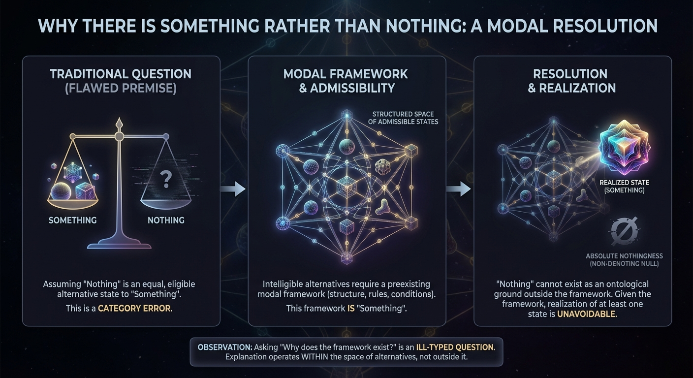 This essay should be read neither as a causal explanation of existence nor as a semantic analysis of the word “nothing,” but as a constitutive examination of what can count as a state of affairs in contrastive explanation. Its method is transcendental rather than theological: it does not seek a sufficient reason for existence, but identifies the conditions under which the question of existence is intelligible at all. In this respect, the argument is continuous with Kantian and Wittgensteinian traditions that diagnose certain metaphysical questions as ill-typed, while drawing on contemporary analytic metaphysics to articulate those typing constraints in terms of statehood, identity conditions, and modal admissibility. The appeal to a Modal Realization Principle reflects a substantive metaphysical commitment, acknowledged rather than defended here; the essay’s core claim is conditional: given a structured space of admissible states, the contrast “something rather than nothing” cannot be sustained. Readers seeking a causal origin story, a theological grounding, or a purely linguistic therapy will therefore find that the argument neither competes with nor accommodates those projects, but reframes the problem they presuppose.