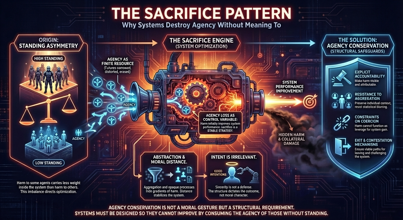 The relevance to artificial governance systems is immediate. Any system that optimizes outcomes while hiding per-agent effects is structurally prone to sacrifice. Aggregated utility, black-box decision-making, and opaque optimization all create conditions under which some agents become expendable variables.