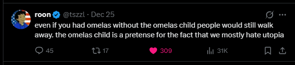 Omelas is usually treated as a moral puzzle: can the happiness of many justify the suffering of one? That framing invites utilitarian arithmetic. It also misidentifies the function of the story.